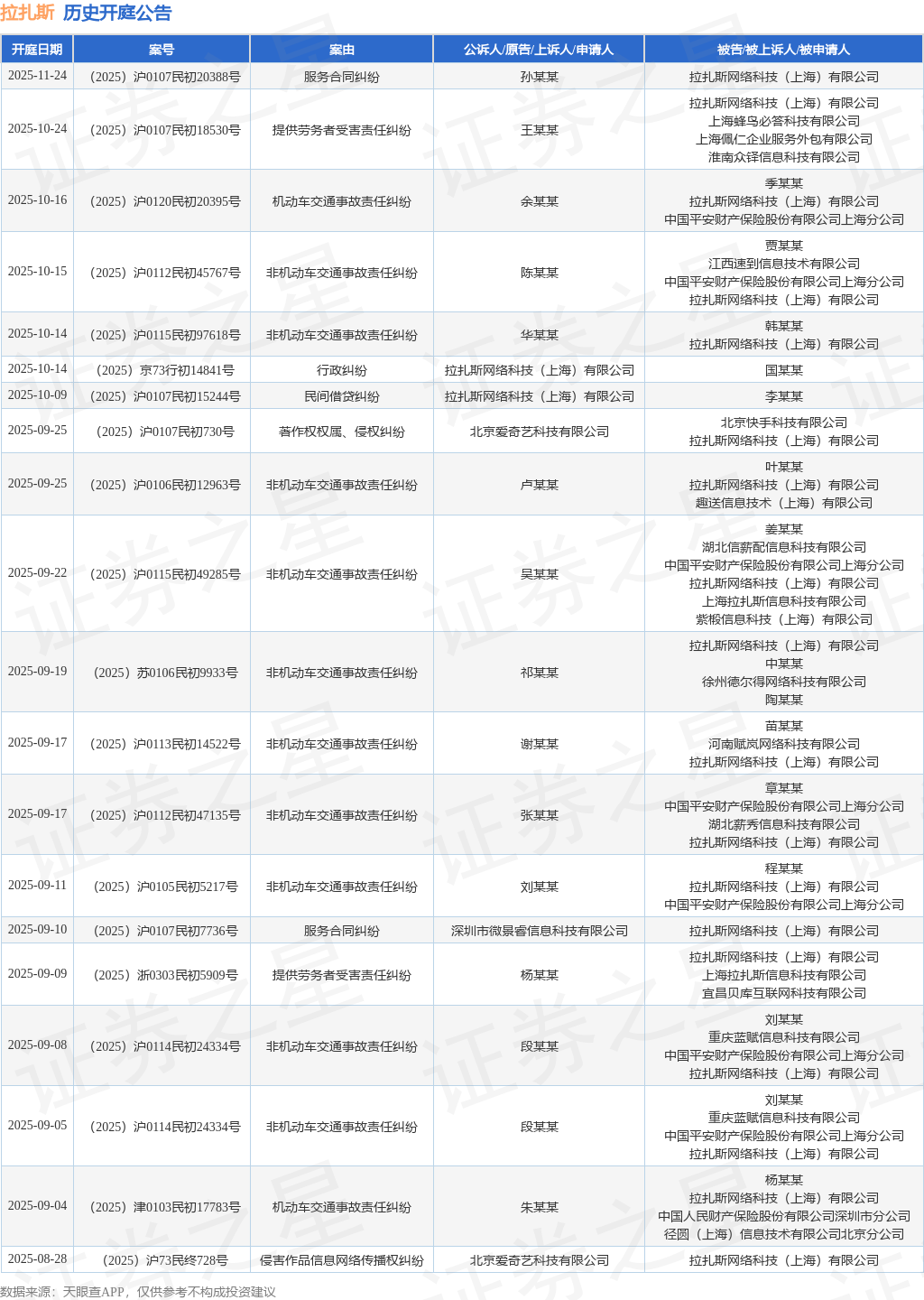 案号:(2025)沪0115民初49285号根据统计,近一年内以拉扎斯网络科技(上海)有限公司为当事人的历史开庭公告有216则,其中案由为“非机动车交通事故责任纠纷”的公告以92则居首,其次为“劳动争议”有29则,“机动车交通事故责任纠纷”有23则。历史开庭公告(前20条)如下: