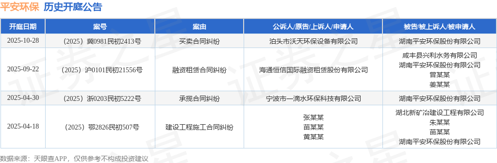 案号:(2025)沪0101民初21556号根据统计,近一年内以湖南平安环保股份有限公司为当事人的历史开庭公告有4则,其中案由为“买卖合同纠纷”的公告以1则居首,其次为“建设工程施工合同纠纷”有1则,“承揽合同纠纷”有1则。历史开庭公告如下: