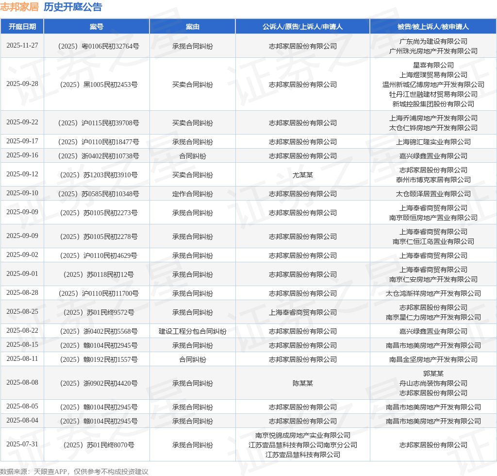 案号:(2025)沪0115民初39708号根据统计,近一年内以志邦家居股份有限公司为当事人的历史开庭公告有162则,其中案由为“承揽合同纠纷”的公告以56则居首,其次为“买卖合同纠纷”有48则,“建设工程分包合同纠纷”有11则。历史开庭公告(前20条)如下: