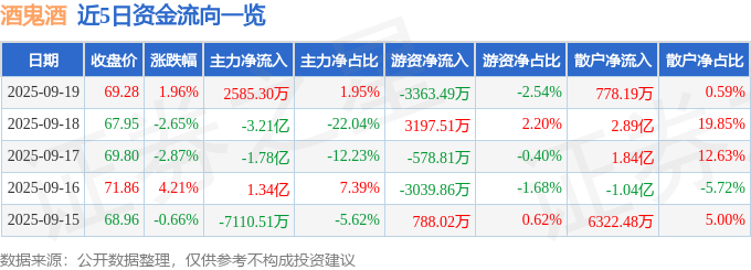 证券之星消息,截至2025年9月19日收盘,酒鬼酒(000799)报收于69.28元,上涨1.96%,换手率6.05%,成交量19.66万手,成交额13.27亿元。