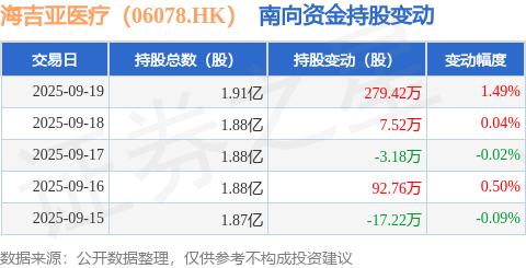 证券之星消息,9月19日南向资金增持279.42万股海吉亚医疗(06078.HK)。近5个交易日中,获南向资金增持的有3天,累计净增持359.3万股。近20个交易日中,获南向资金增持的有11天,累计净增持401.14万股。截至目前,南向资金持有海吉亚医疗(06078.HK)1.91亿股,占公司已发行普通股的30.81%。