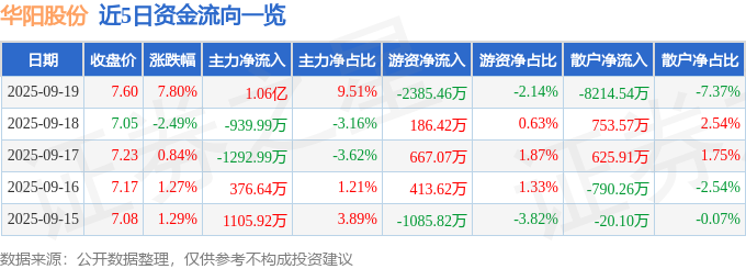 证券之星消息,截至2025年9月19日收盘,华阳股份(600348)报收于7.6元,上涨7.8%,换手率4.13%,成交量148.83万手,成交额11.15亿元。