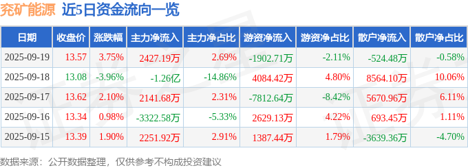 证券之星消息,截至2025年9月19日收盘,兖矿能源(600188)报收于13.57元,上涨3.75%,换手率1.14%,成交量67.27万手,成交额9.03亿元。