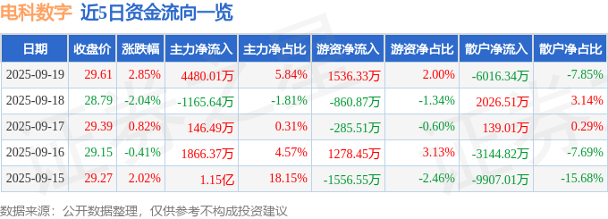 证券之星消息,截至2025年9月19日收盘,电科数字(600850)报收于29.61元,上涨2.85%,换手率4.2%,成交量25.79万手,成交额7.67亿元。