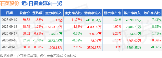 证券之星消息,截至2025年9月19日收盘,石英股份(603688)报收于39.52元,上涨1.88%,换手率4.43%,成交量24.01万手,成交额9.55亿元。