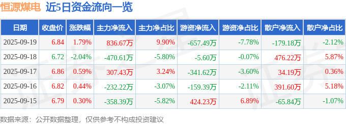 证券之星消息,截至2025年9月19日收盘,恒源煤电(600971)报收于6.84元,上涨1.79%,换手率1.04%,成交量12.43万手,成交额8453.05万元。