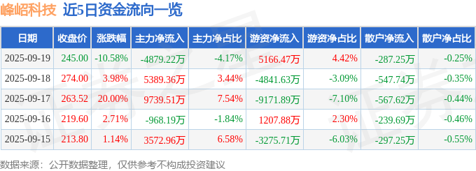 证券之星消息,截至2025年9月19日收盘,峰岹科技(688279)报收于245.0元,下跌10.58%,换手率8.42%,成交量4.7万手,成交额11.69亿元。