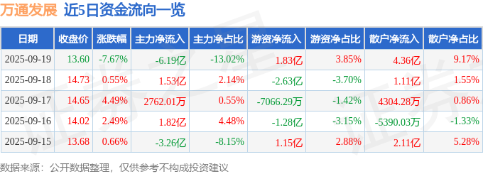 证券之星消息,截至2025年9月19日收盘,万通发展(600246)报收于13.6元,下跌7.67%,换手率18.08%,成交量341.79万手,成交额47.52亿元。