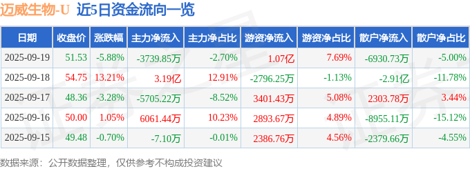 证券之星消息,截至2025年9月19日收盘,迈威生物(688062)报收于51.53元,下跌5.88%,换手率13.05%,成交量26.63万手,成交额13.87亿元。