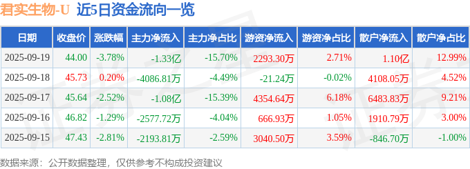 证券之星消息,截至2025年9月19日收盘,君实生物(688180)报收于44.0元,下跌3.78%,换手率2.48%,成交量18.98万手,成交额8.47亿元。