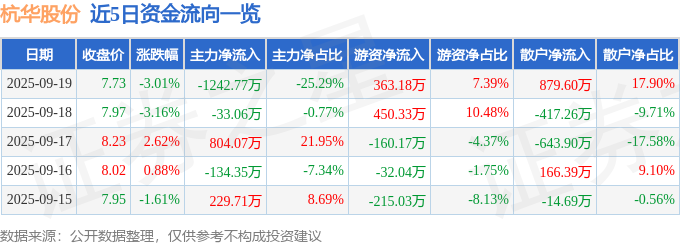 证券之星消息,截至2025年9月19日收盘,杭华股份(688571)报收于7.73元,下跌3.01%,换手率1.49%,成交量6.33万手,成交额4913.44万元。