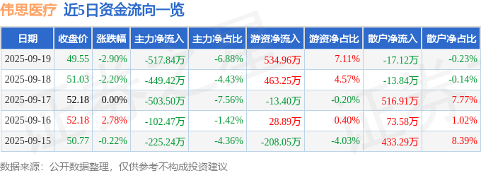 证券之星消息,截至2025年9月19日收盘,伟思医疗(688580)报收于49.55元,下跌2.9%,换手率1.57%,成交量1.51万手,成交额7524.59万元。