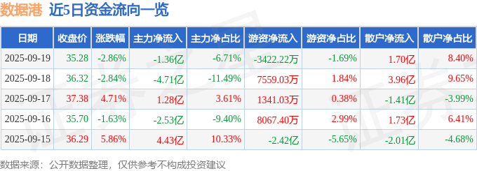 证券之星消息,截至2025年9月19日收盘,数据港(603881)报收于35.28元,下跌2.86%,换手率7.89%,成交量56.69万手,成交额20.23亿元。