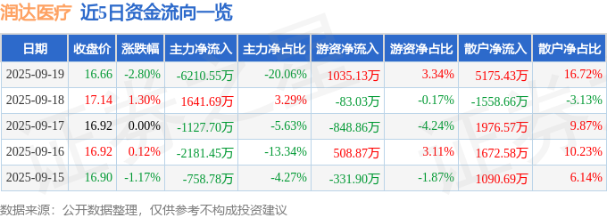 证券之星消息,截至2025年9月19日收盘,润达医疗(603108)报收于16.66元,下跌2.8%,换手率3.05%,成交量18.44万手,成交额3.1亿元。