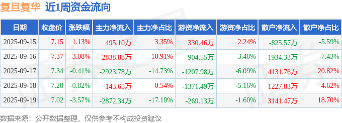 资金流向数据方面,本周复旦复华主力资金合计净流出2318.48万元,游资资金合计净流出3422.68万元,散户资金合计净流入5741.17万元。本周资金流向一览见下表: