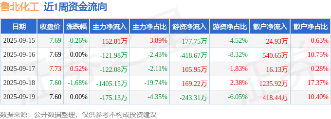 资金流向数据方面,本周鲁北化工主力资金合计净流出1671.52万元,游资资金合计净流出564.55万元,散户资金合计净流入2236.08万元。本周资金流向一览见下表: