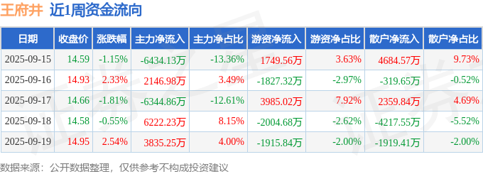 资金流向数据方面,本周王府井主力资金合计净流出574.54万元,游资资金合计净流出13.26万元,散户资金合计净流入587.8万元。本周资金流向一览见下表: