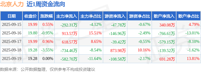 资金流向数据方面,本周北京人力主力资金合计净流出77.33万元,游资资金合计净流入531.24万元,散户资金合计净流出453.92万元。本周资金流向一览见下表: