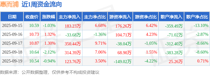 资金流向数据方面,本周惠而浦主力资金合计净流入938.13万元,游资资金合计净流入162.82万元,散户资金合计净流出1100.94万元。本周资金流向一览见下表: