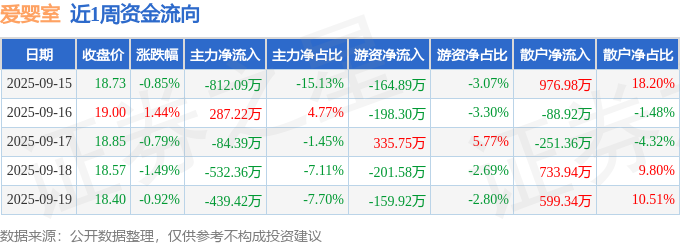 资金流向数据方面,本周爱婴室主力资金合计净流出1581.04万元,游资资金合计净流出388.95万元,散户资金合计净流入1969.99万元。本周资金流向一览见下表: