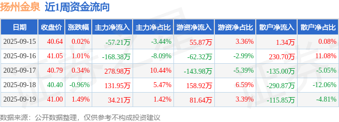 资金流向数据方面,本周扬州金泉主力资金合计净流入219.55万元,游资资金合计净流入90.14万元,散户资金合计净流出309.68万元。本周资金流向一览见下表:
