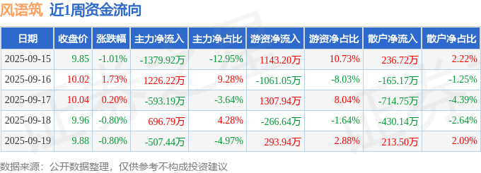 资金流向数据方面,本周风语筑主力资金合计净流出557.54万元,游资资金合计净流入1417.39万元,散户资金合计净流出859.84万元。本周资金流向一览见下表: