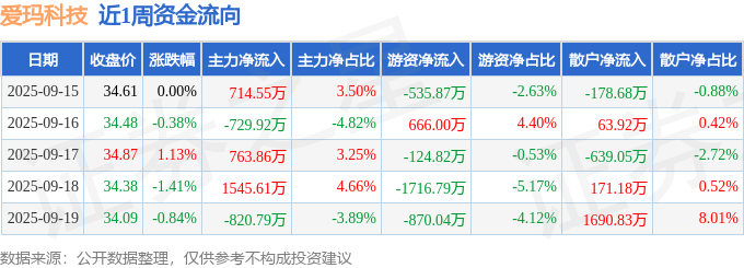 资金流向数据方面,本周爱玛科技主力资金合计净流入1473.32万元,游资资金合计净流出2581.52万元,散户资金合计净流入1108.2万元。本周资金流向一览见下表: