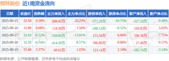 资金流向数据方面,本周恒林股份主力资金合计净流入113.12万元,游资资金合计净流入4.1万元,散户资金合计净流出117.22万元。本周资金流向一览见下表: