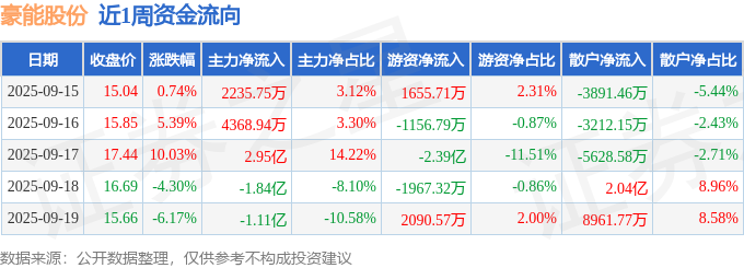 资金流向数据方面,本周豪能股份主力资金合计净流入6606.53万元,游资资金合计净流出2.33亿元,散户资金合计净流入1.66亿元。本周资金流向一览见下表: