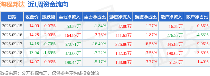 资金流向数据方面,本周海程邦达主力资金合计净流出1024.64万元,游资资金合计净流入696.71万元,散户资金合计净流入327.92万元。本周资金流向一览见下表: