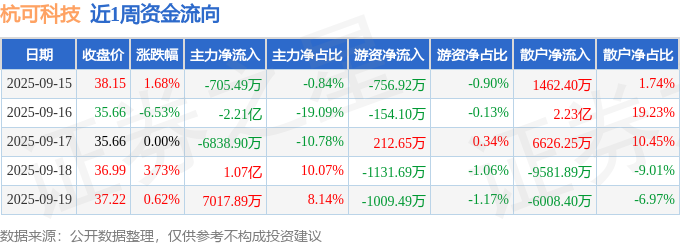 资金流向数据方面,本周杭可科技主力资金合计净流出1.19亿元,游资资金合计净流出2839.55万元,散户资金合计净流入1.48亿元。本周资金流向一览见下表: