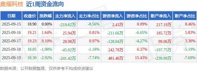 资金流向数据方面,本周奥福科技主力资金合计净流出451.14万元,游资资金合计净流入386.91万元,散户资金合计净流入64.23万元。本周资金流向一览见下表: