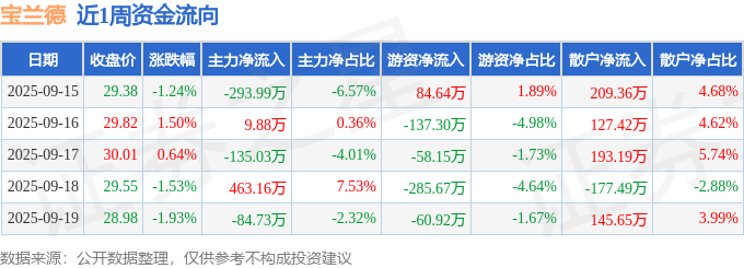 资金流向数据方面,本周宝兰德主力资金合计净流出40.72万元,游资资金合计净流出457.41万元,散户资金合计净流入498.13万元。本周资金流向一览见下表: