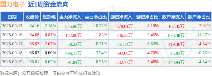 资金流向数据方面,本周国力电子主力资金合计净流出1360.69万元,游资资金合计净流入2189.23万元,散户资金合计净流出828.54万元。本周资金流向一览见下表: