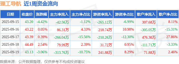 资金流向数据方面,本周理工导航主力资金合计净流出456.06万元,游资资金合计净流入16.96万元,散户资金合计净流入439.1万元。本周资金流向一览见下表:
