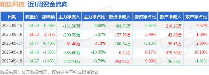 资金流向数据方面,本周和达科技主力资金合计净流出884.04万元,游资资金合计净流入232.59万元,散户资金合计净流入651.46万元。本周资金流向一览见下表: