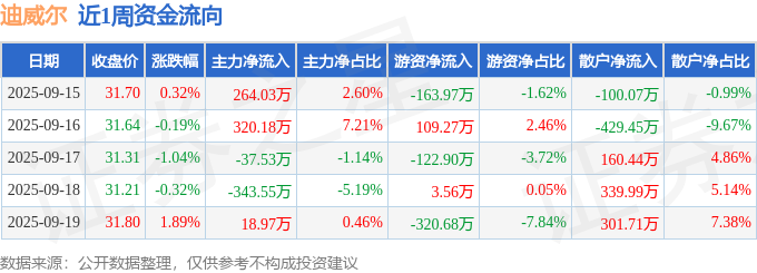 资金流向数据方面,本周迪威尔主力资金合计净流入222.1万元,游资资金合计净流出494.72万元,散户资金合计净流入272.62万元。本周资金流向一览见下表: