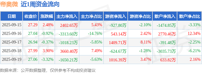 资金流向数据方面,本周帝奥微主力资金合计净流入81.01万元,游资资金合计净流入1416.77万元,散户资金合计净流出1497.78万元。本周资金流向一览见下表: