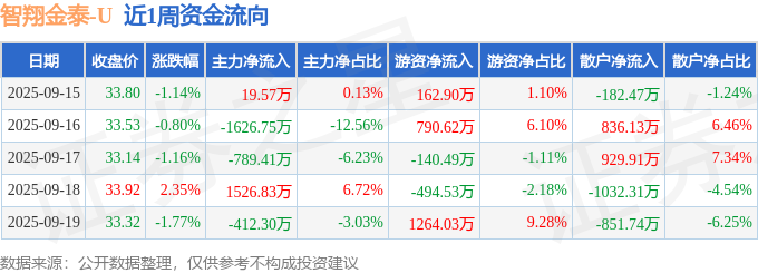 资金流向数据方面,本周智翔金泰主力资金合计净流出1282.05万元,游资资金合计净流入1582.53万元,散户资金合计净流出300.48万元。本周资金流向一览见下表: