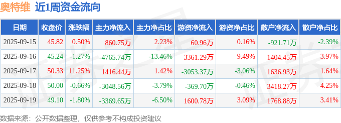资金流向数据方面,本周奥特维主力资金合计净流出8906.77万元,游资资金合计净流入1599.95万元,散户资金合计净流入7306.82万元。本周资金流向一览见下表: