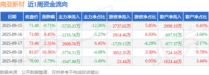 资金流向数据方面,本周南亚新材主力资金合计净流出1.08亿元,游资资金合计净流入6998.15万元,散户资金合计净流入3771.51万元。本周资金流向一览见下表: