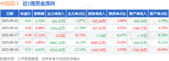 资金流向数据方面,本周中巨芯主力资金合计净流入2966.96万元,游资资金合计净流入277.54万元,散户资金合计净流出3244.5万元。本周资金流向一览见下表: