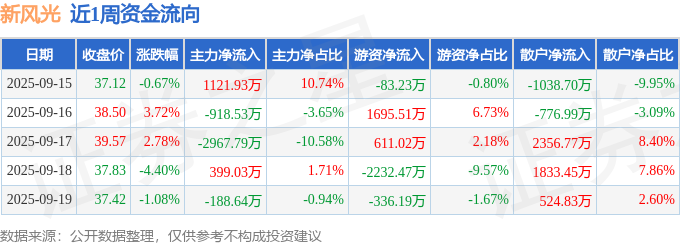 资金流向数据方面,本周新风光主力资金合计净流出2554.0万元,游资资金合计净流出345.36万元,散户资金合计净流入2899.36万元。本周资金流向一览见下表: