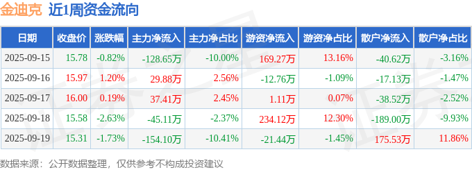 资金流向数据方面,本周金迪克主力资金合计净流出260.57万元,游资资金合计净流入370.3万元,散户资金合计净流出109.73万元。本周资金流向一览见下表: