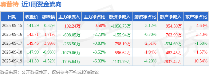 资金流向数据方面,本周奥普特主力资金合计净流出3554.0万元,游资资金合计净流出949.67万元,散户资金合计净流入4503.67万元。本周资金流向一览见下表: