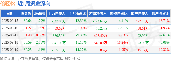 资金流向数据方面,本周倍轻松主力资金合计净流出1545.61万元,游资资金合计净流入815.58万元,散户资金合计净流入730.04万元。本周资金流向一览见下表: