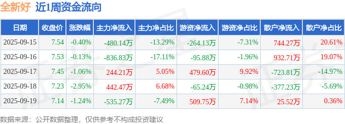 资金流向数据方面,本周全新好主力资金合计净流出1165.57万元,游资资金合计净流入564.1万元,散户资金合计净流入601.47万元。本周资金流向一览见下表: