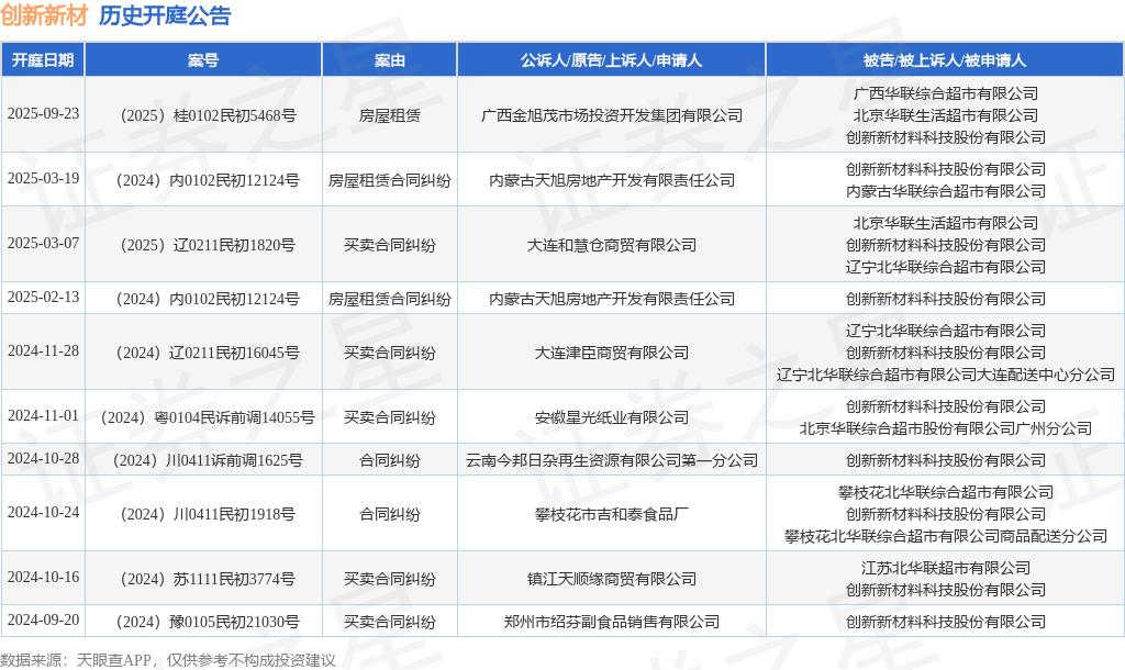 案号:(2025)桂0102民初5468号根据统计,近一年内以创新新材料科技股份有限公司为当事人的历史开庭公告有10则,其中案由为“买卖合同纠纷”的公告以5则居首,其次为“合同纠纷”有2则,“房屋租赁合同纠纷”有2则。历史开庭公告如下: