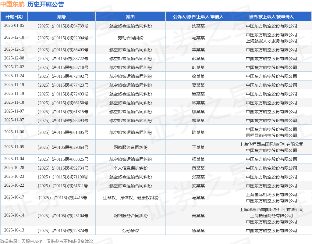 案号:(2025)沪0115民初106067号根据统计,近一年内以中国东方航空股份有限公司为当事人的历史开庭公告有162则,其中案由为“航空旅客运输合同纠纷”的公告以110则居首,其次为“生命权、身体权、健康权纠纷”有8则,“劳动合同纠纷”有7则。历史开庭公告(前20条)如下: