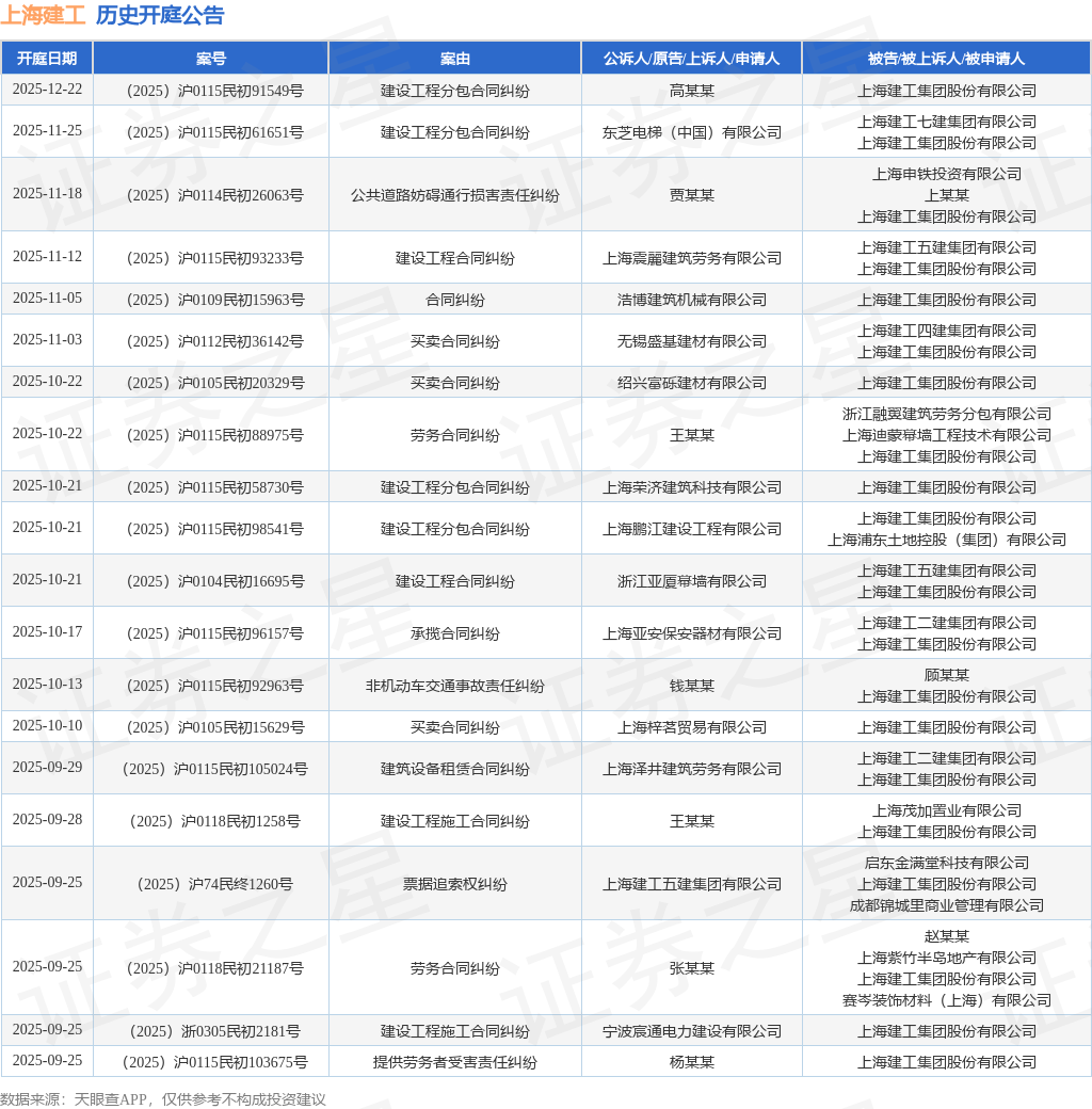 案号:(2025)浙0109民初18363号根据统计,近一年内以上海建工集团股份有限公司为当事人的历史开庭公告有407则,其中案由为“买卖合同纠纷”的公告以114则居首,其次为“建设工程施工合同纠纷”有99则,“建设工程分包合同纠纷”有44则。历史开庭公告(前20条)如下: